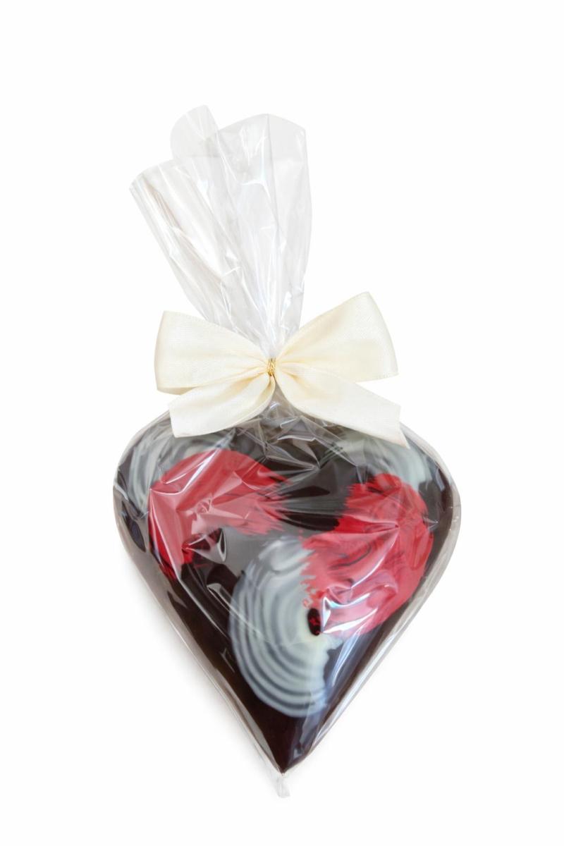 Formované duté srdce z hořké čokolády plněné malými čokoládovými srdíčky. Baleno v celofánu s látkovou mašlí.